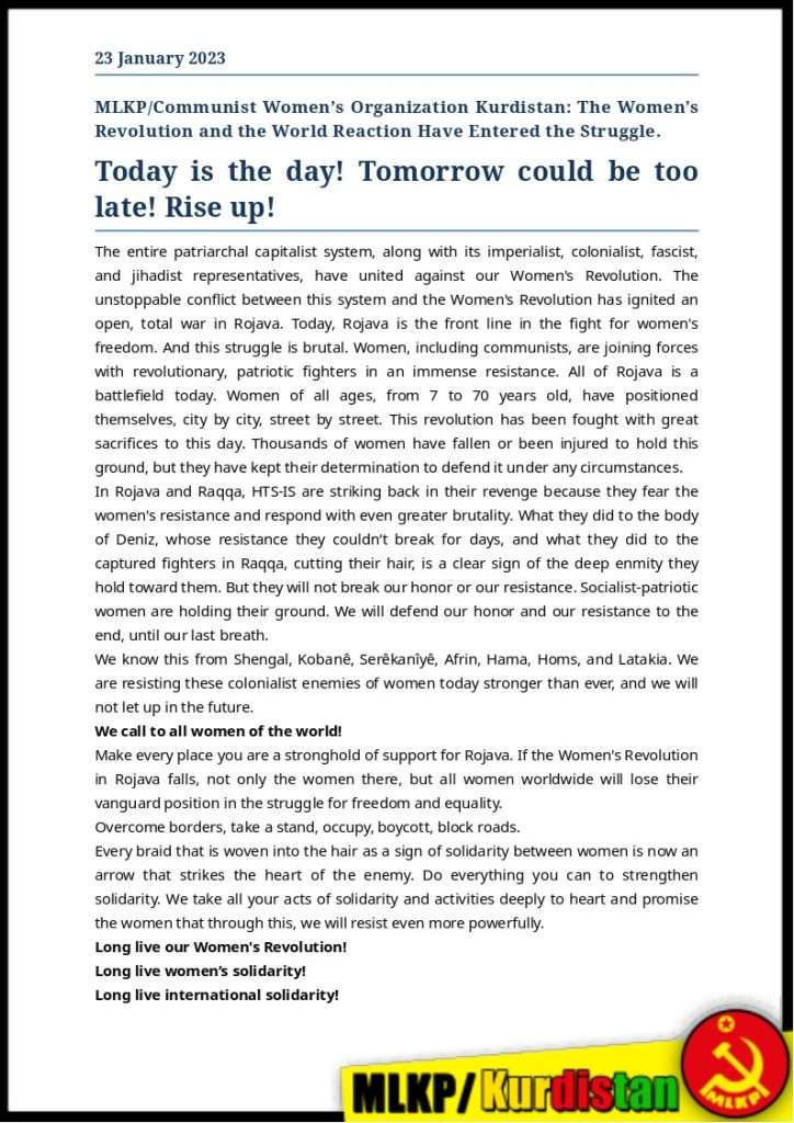 [eng] MLKP/Communist Women`s Organisation (KKÖ) Kurdistan: Today is the day! Tomorrow could be too late! Rise up!